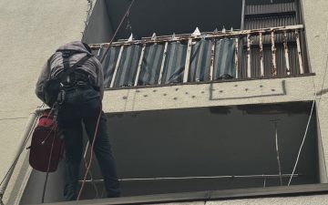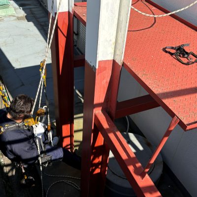 足場が作れない建物が隣接している狭小地や、はしごが届かない高所でも、当社は、屋上や屋根からロープを使いロープアクセスで工事をすることが可能です。