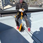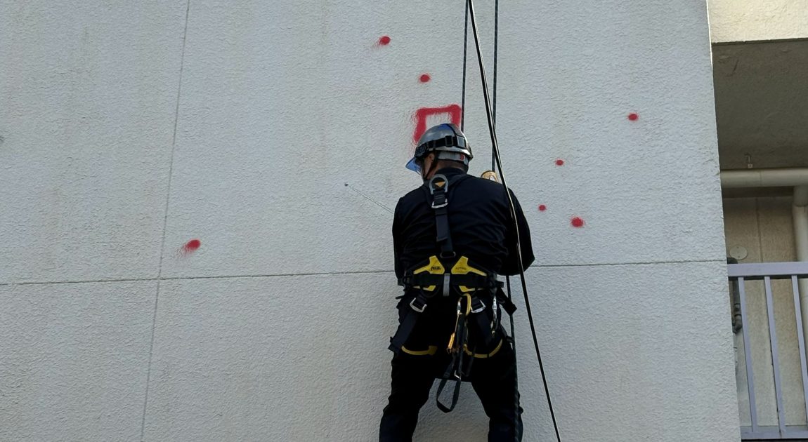 小倉南区のアパートにて、外壁塗装工事に向けたロープアンカー設置と外壁打診調査を行いました。