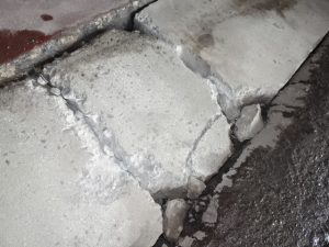 現地に伺うと、倉庫の入り口付近のアスファルトが削れ、コンクリートの境界部分との間に大きな段差が生じていました。