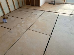 現在はパーティクルボードの上にコンパネを貼る作業の途中で、床の強度をしっかり確保する大切な工程とのこと。